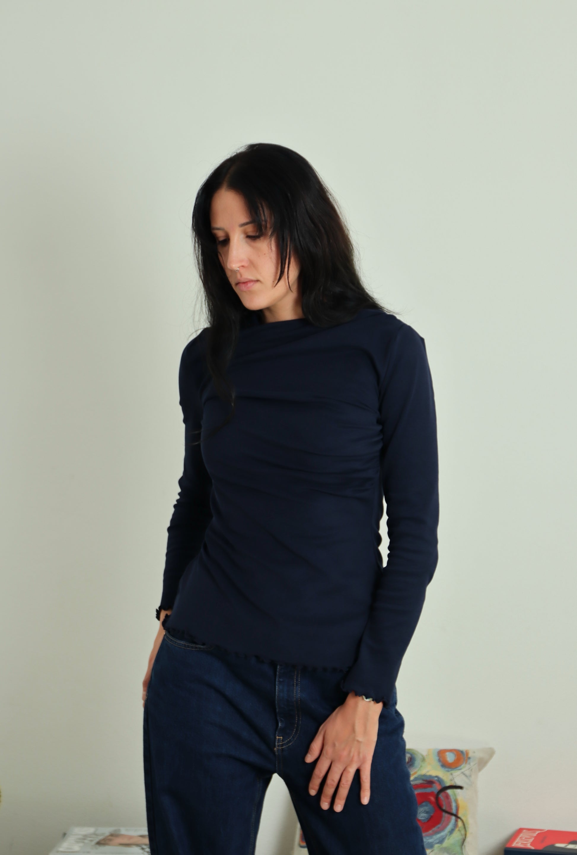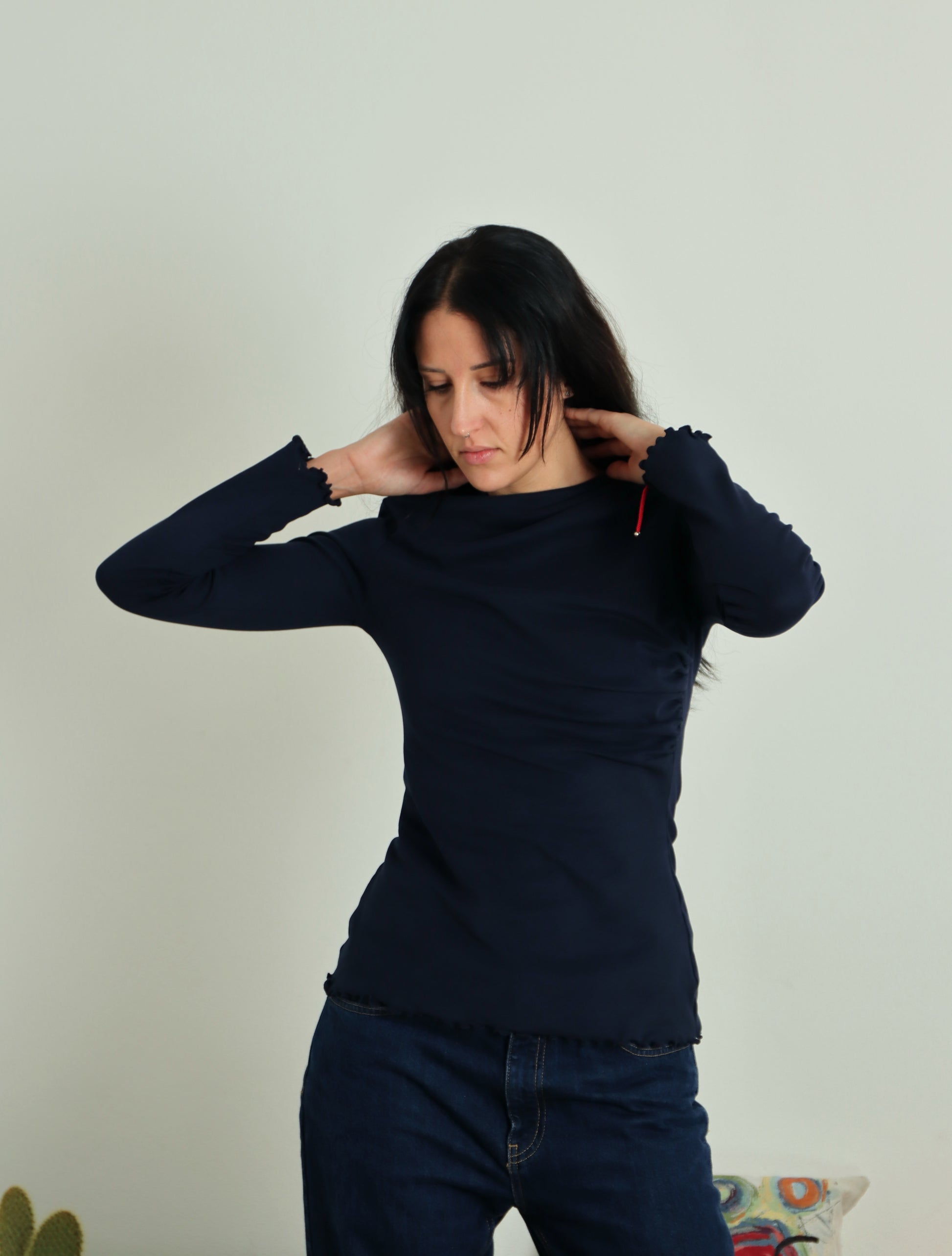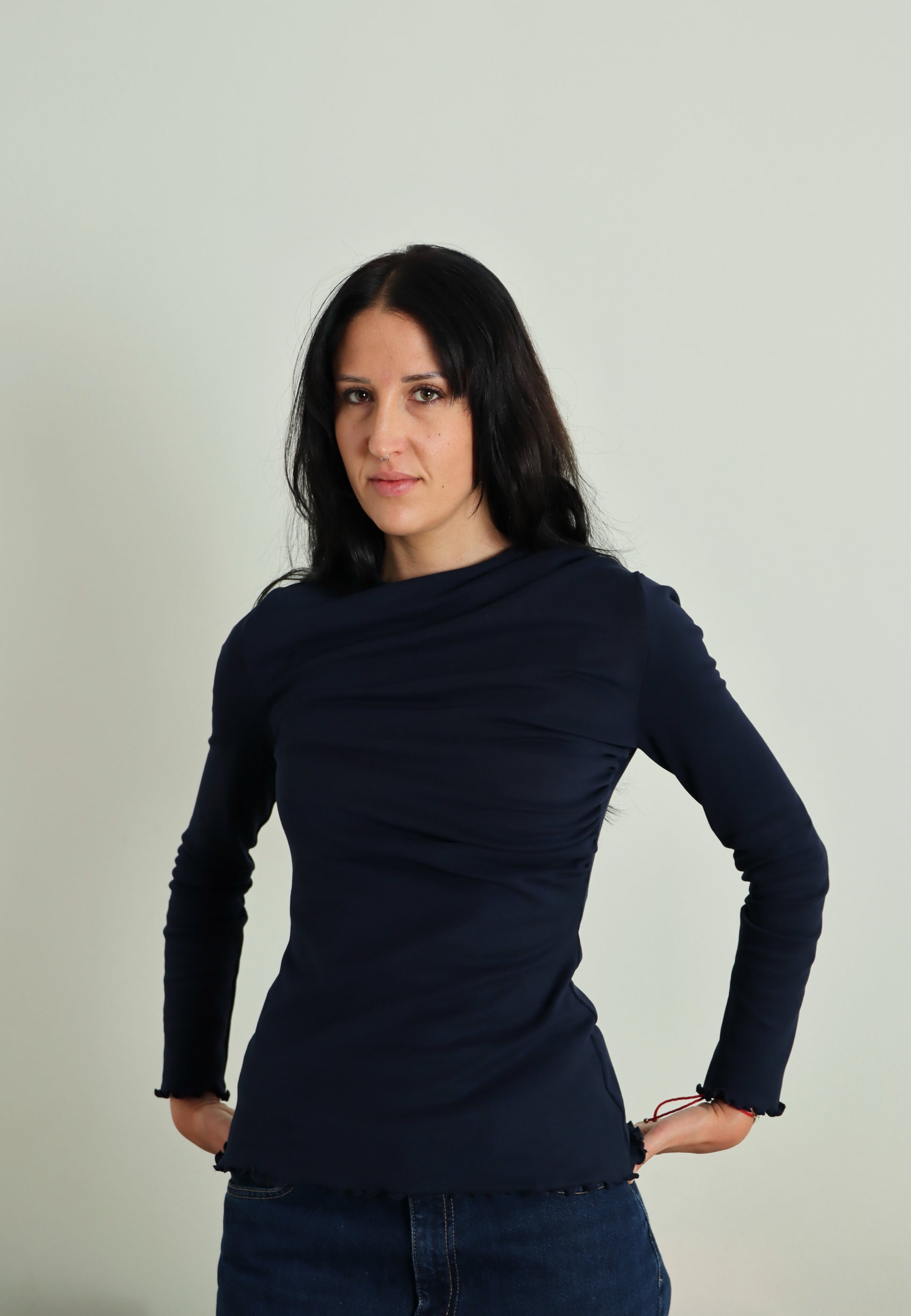 Il DISORDINATOP è il sottogiacca super cool in maglina di cotone con drappeggio arricciato in due direzioni opposte: uno parte dalla spalla, uno dal busto; quest'incrocio crea disordine, da ciò deriva il suo nome, facendoti esclamare: "bè, non è la solita banale maglietta basic, cool!"