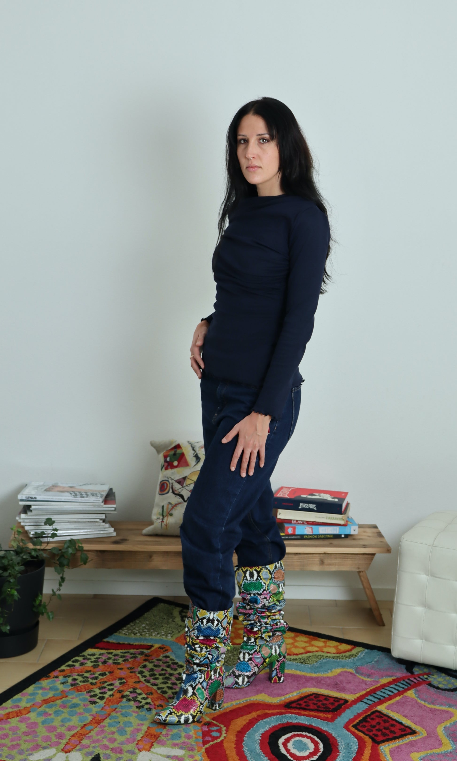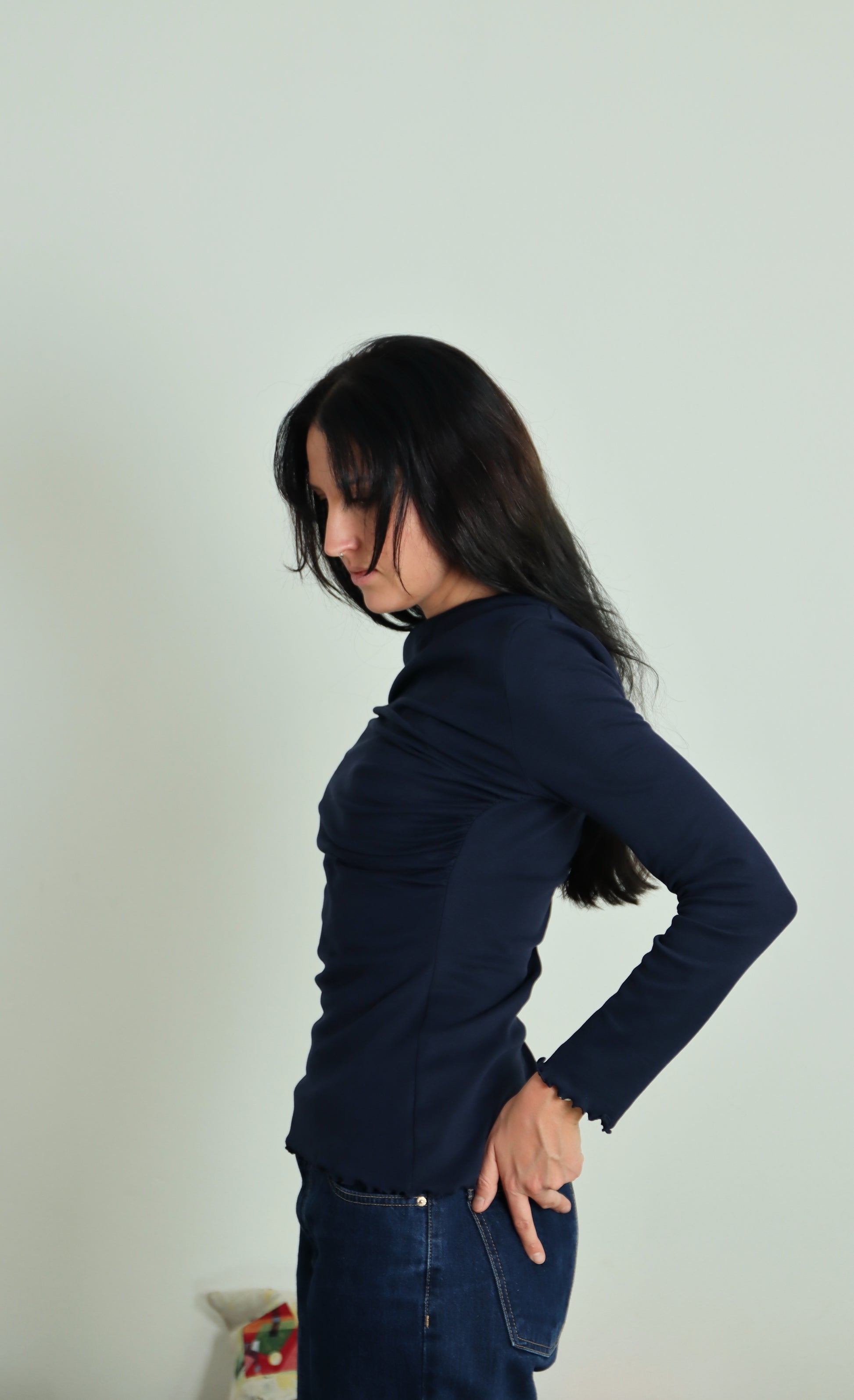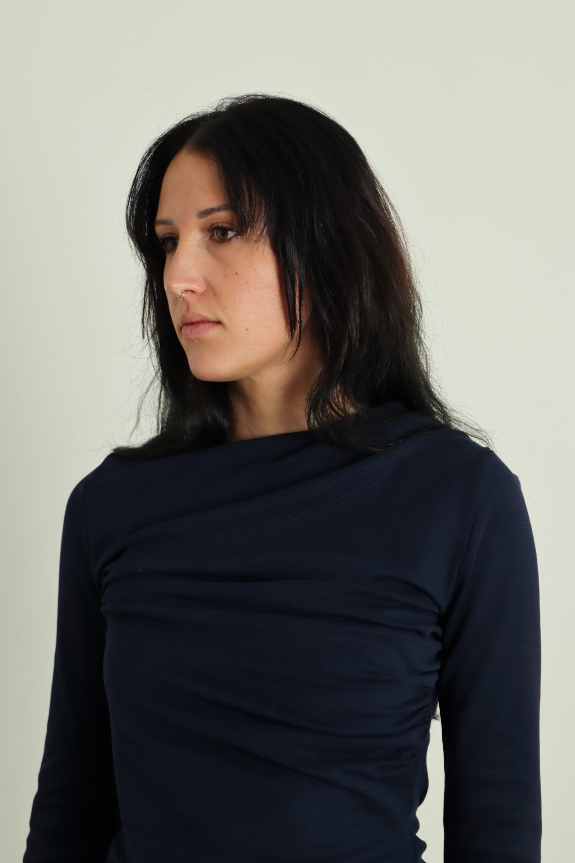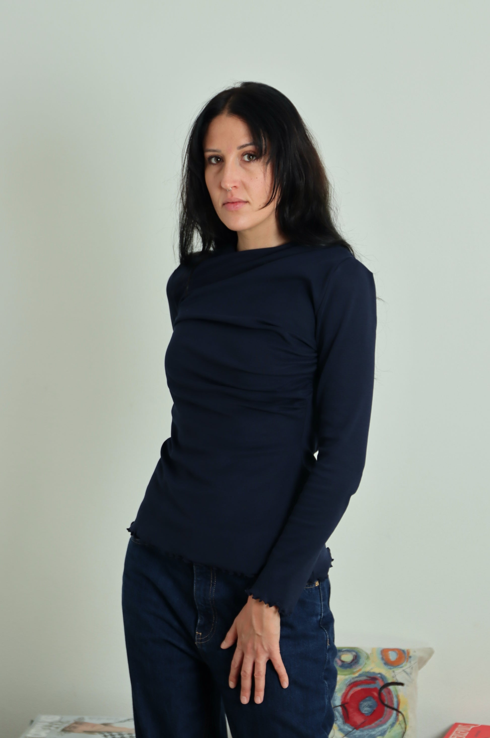 Il DISORDINATOP è il sottogiacca super cool in maglina di cotone con drappeggio arricciato in due direzioni opposte: uno parte dalla spalla, uno dal busto; quest'incrocio crea disordine, da ciò deriva il suo nome, facendoti esclamare: "bè, non è la solita banale maglietta basic, cool!"