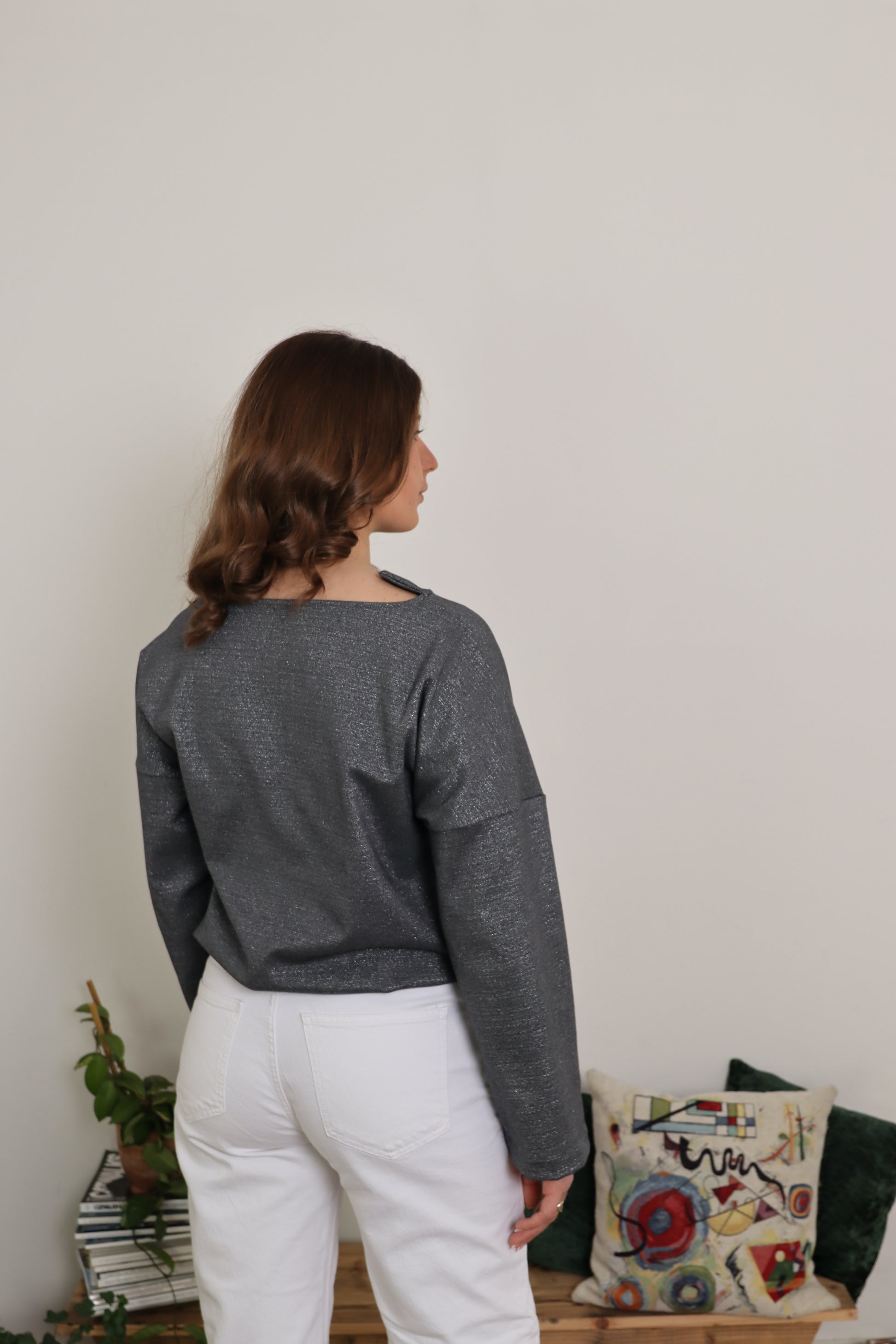La felpa N.2 è la sorella più rilassata della N.1: più più morbido, taglio a kimono e orlo elastico che rimborsa. Il collo è a V, rifinito in modo da interrompersi a livello spalla creando un effetto interessante.