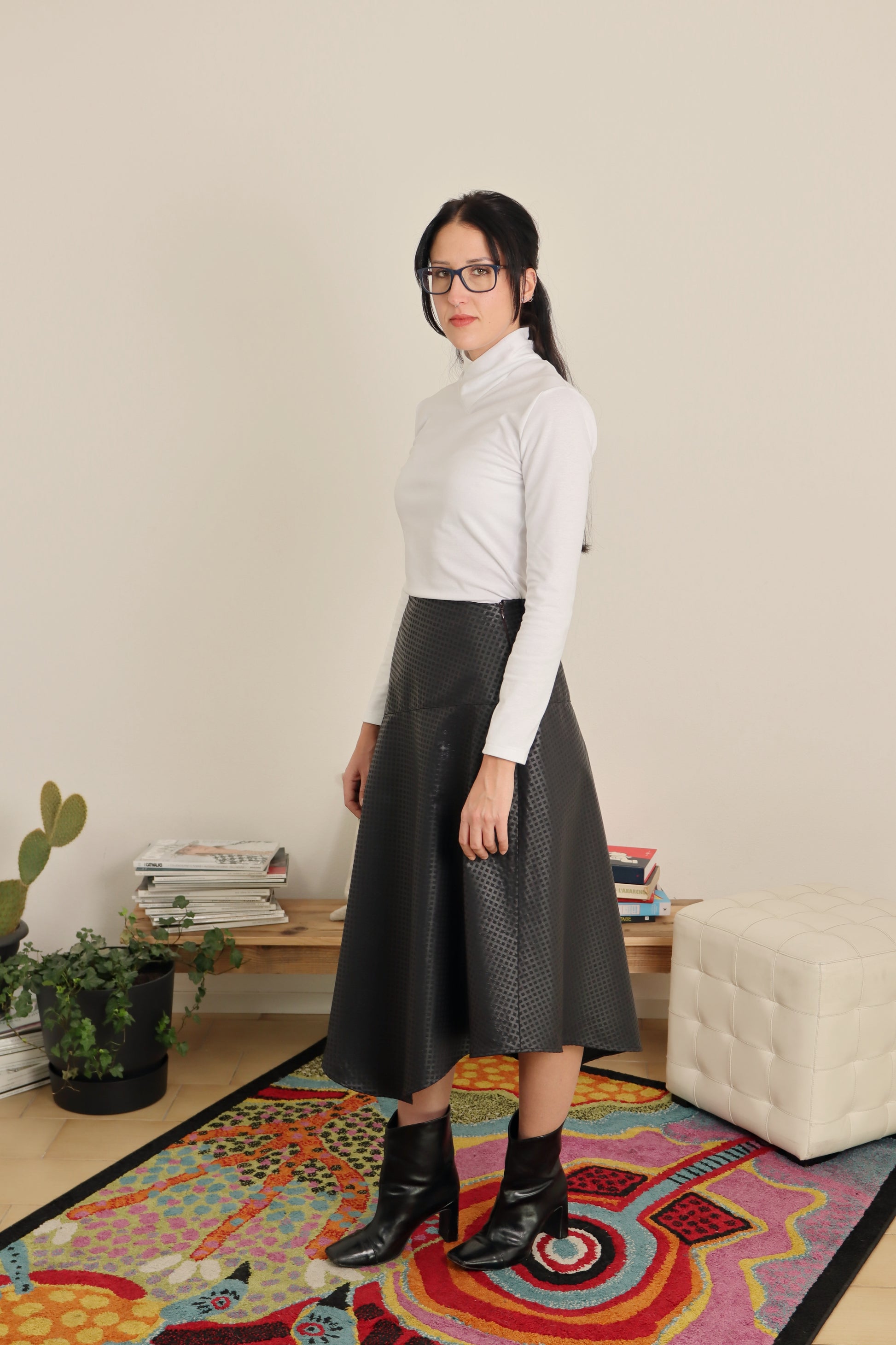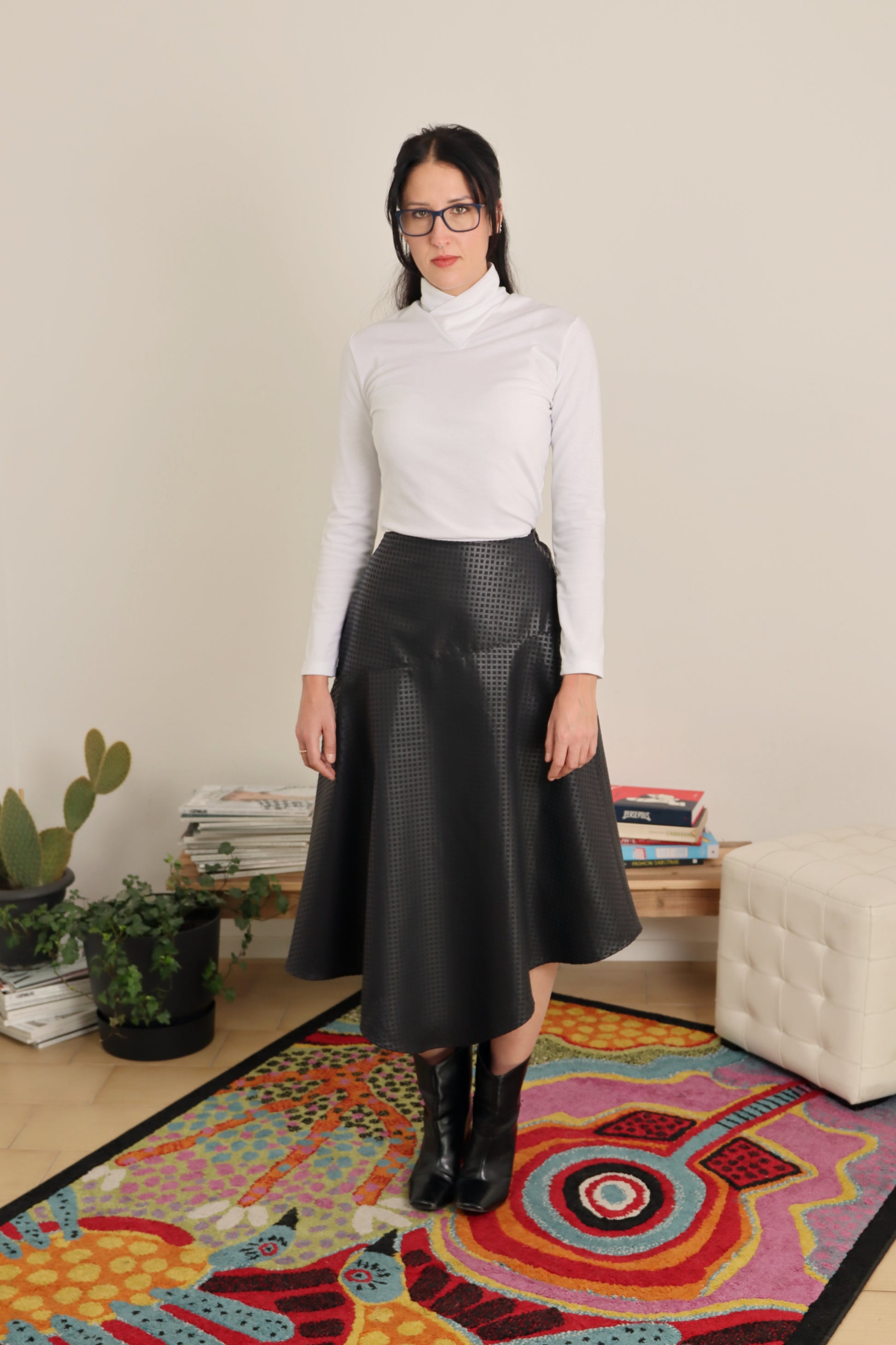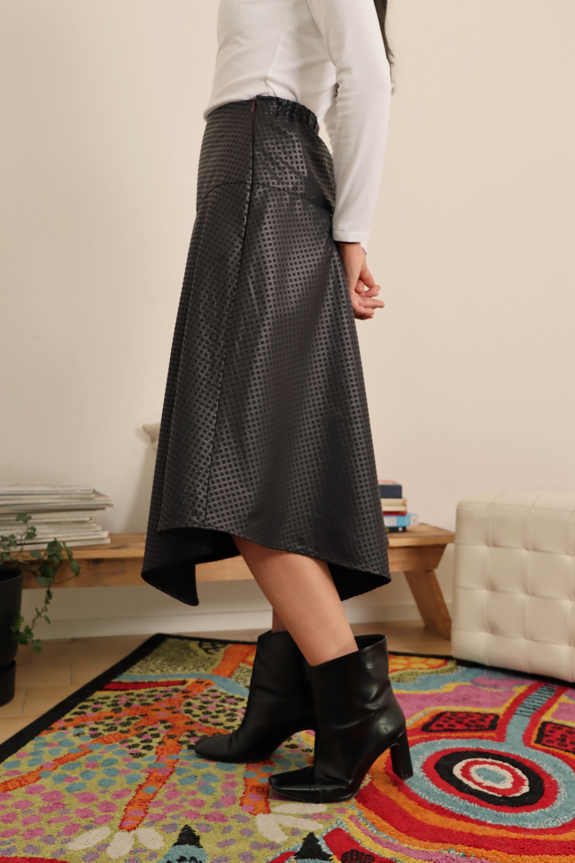 Se ami le gonne, la gonna NyLa deve assolutamente far parte della tua collezione, lo sai perchè? Per il connubio eccezionale tra materiali e capo: il tessuto è un fresco lana con applicato del nylon "a retina" che disegna la fantasia, a quadretti per la variante nera, a pois per quella blu; il modello è una gonna con baschina diagonale, da ui parte la parte svasata con orlo irregolare.