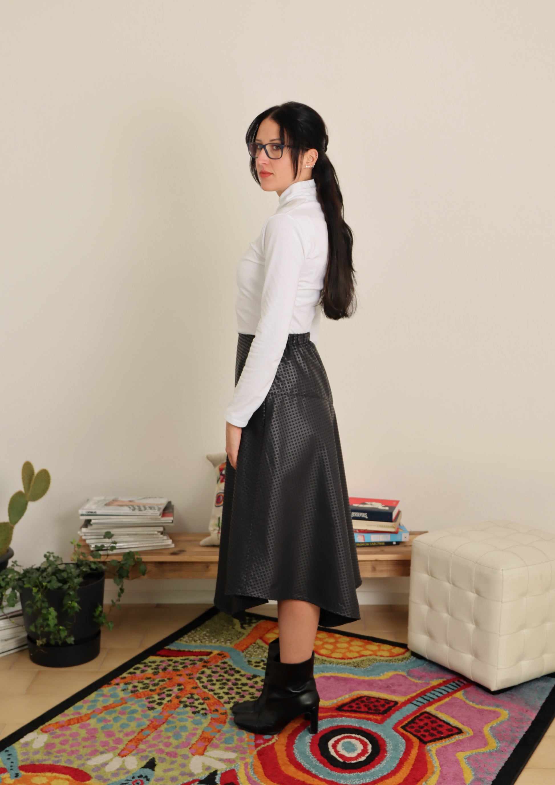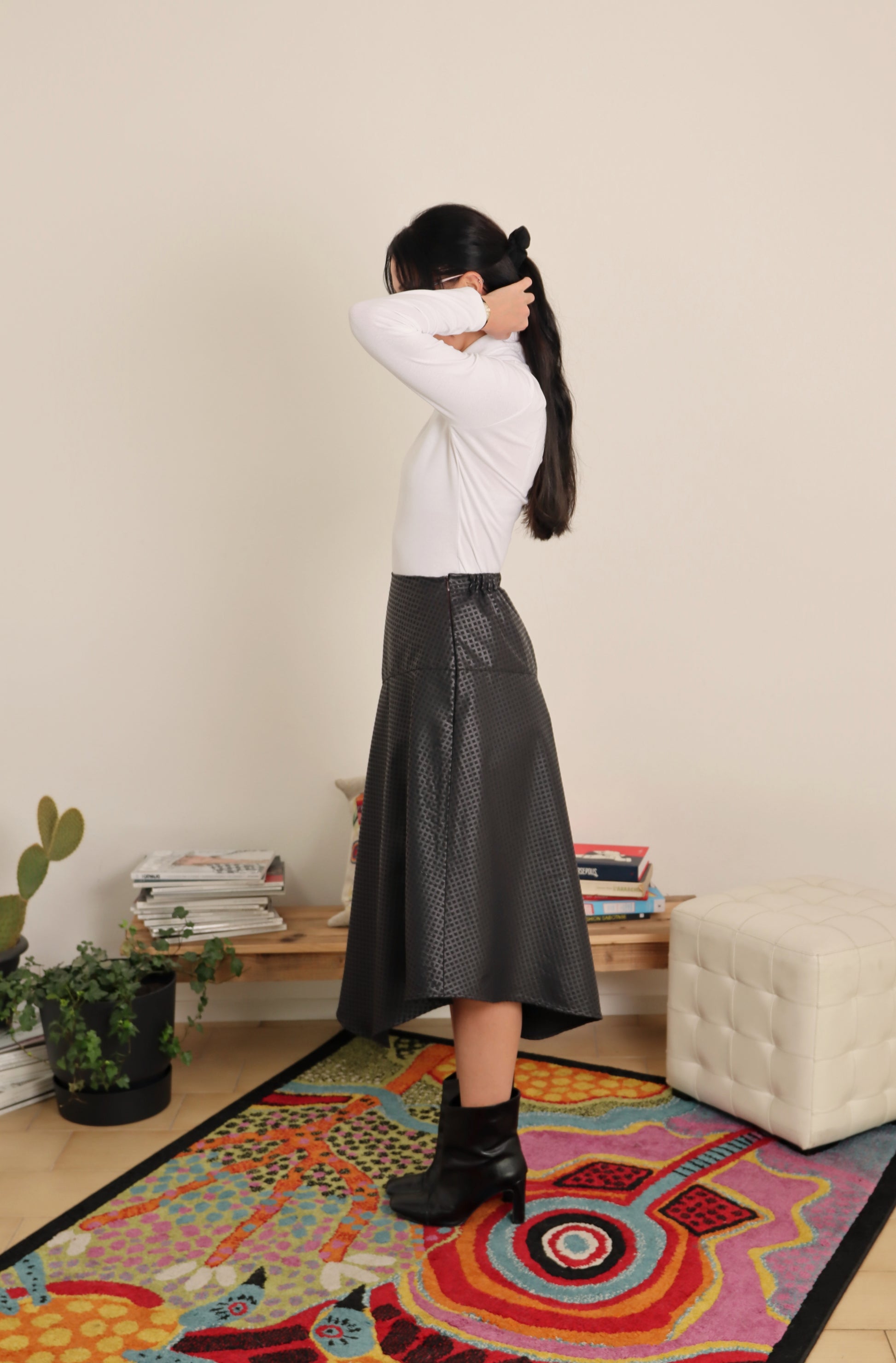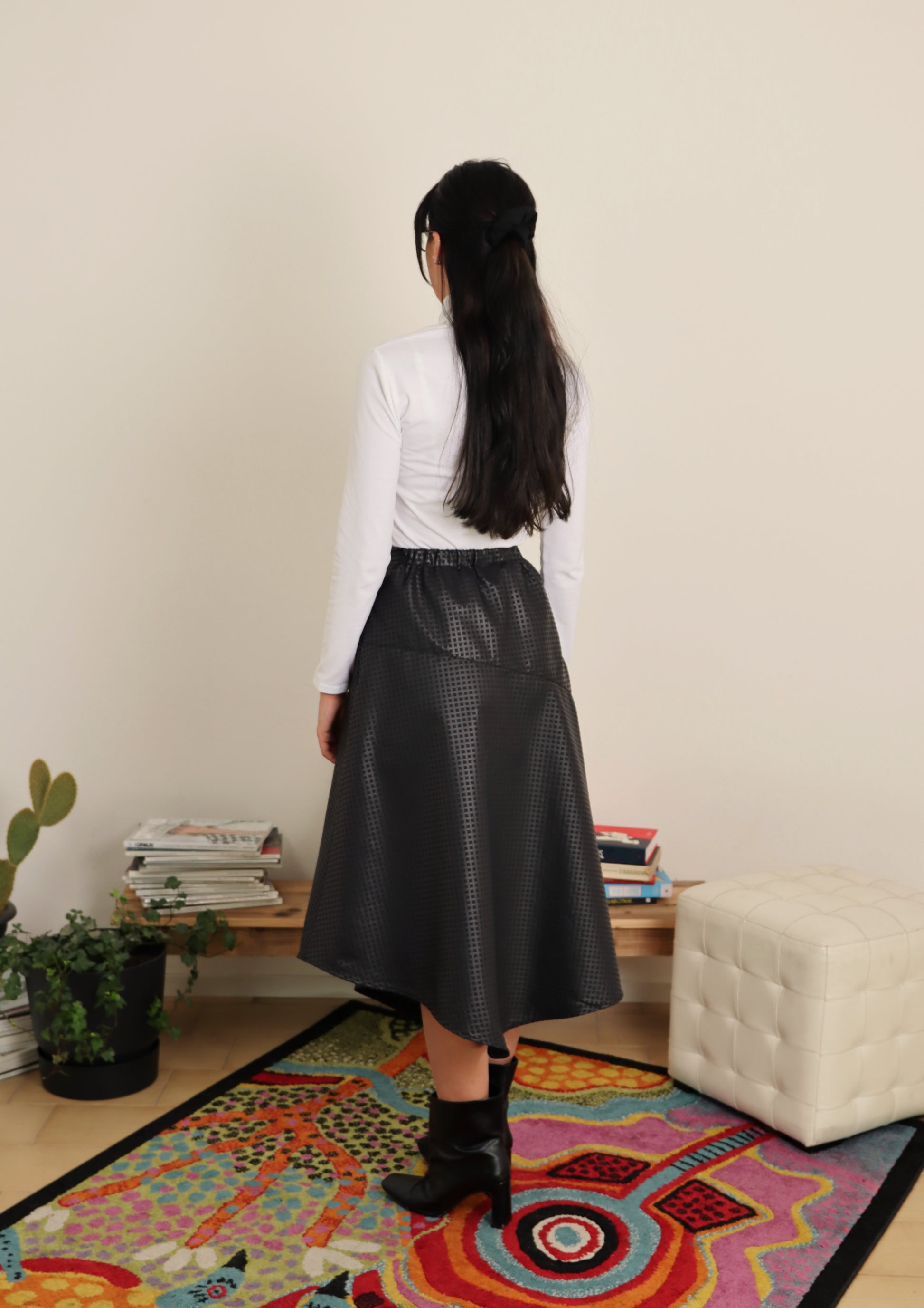 Se ami le gonne, la gonna NyLa deve assolutamente far parte della tua collezione, lo sai perchè? Per il connubio eccezionale tra materiali e capo: il tessuto è un fresco lana con applicato del nylon "a retina" che disegna la fantasia, a quadretti per la variante nera, a pois per quella blu; il modello è una gonna con baschina diagonale, da ui parte la parte svasata con orlo irregolare.