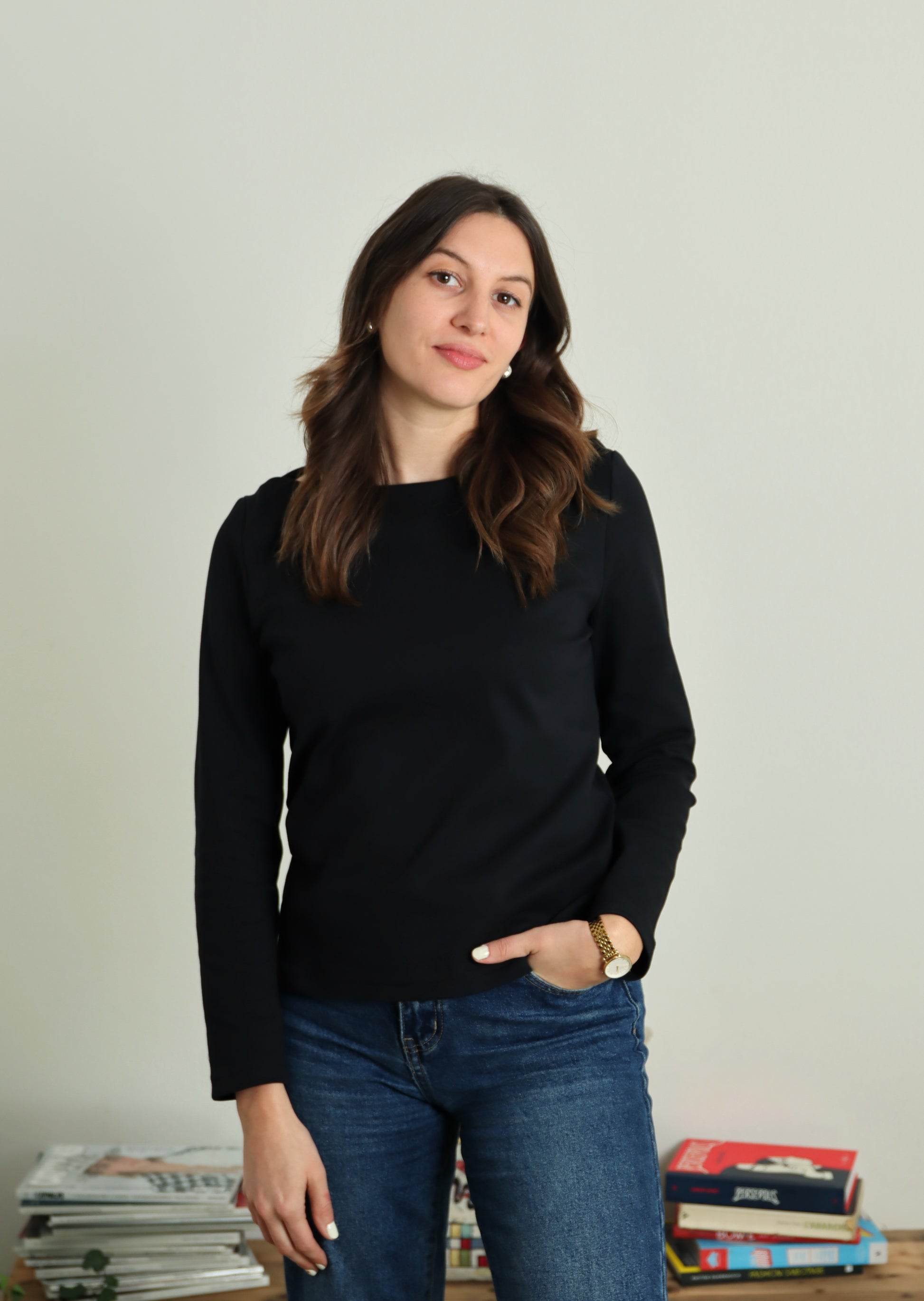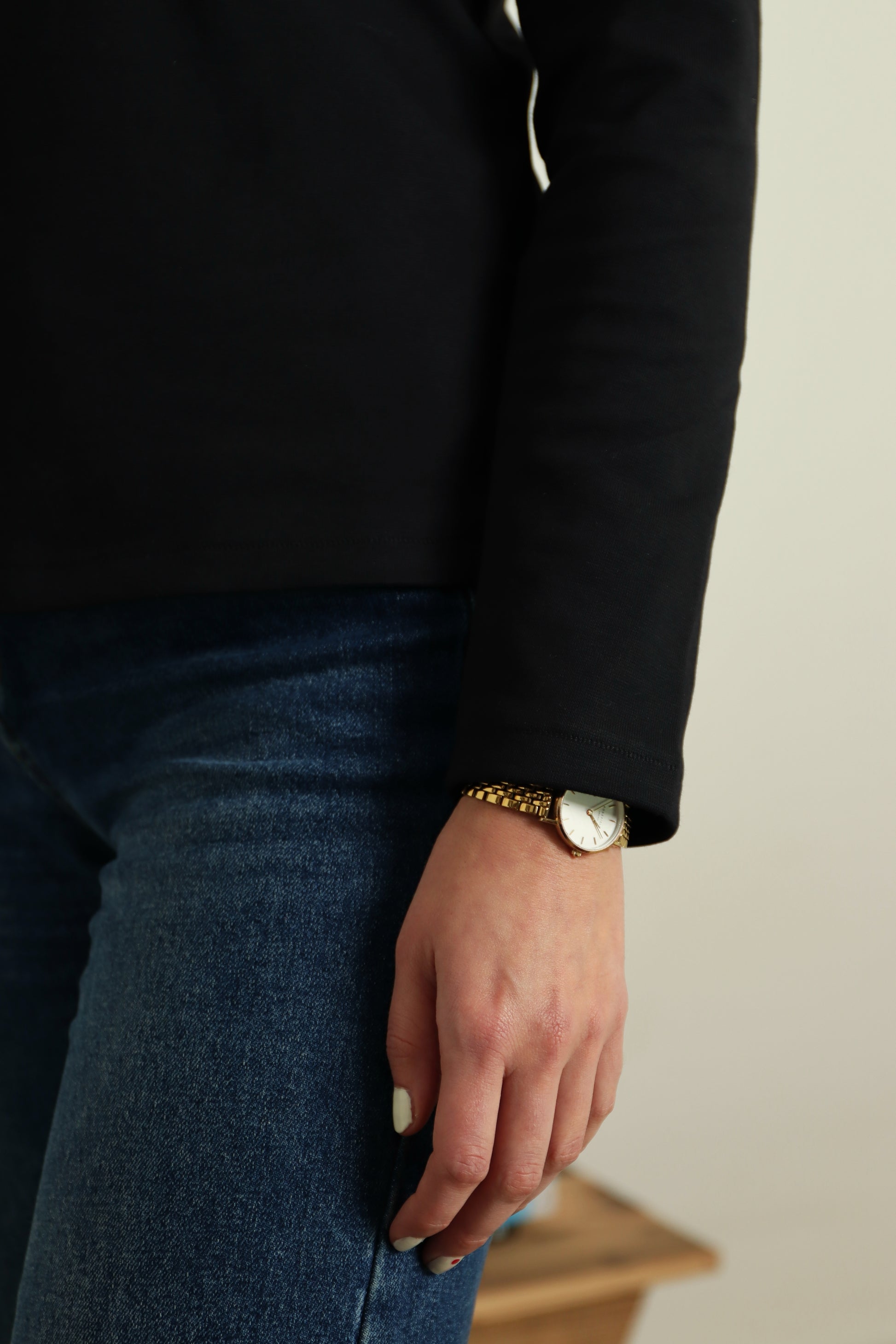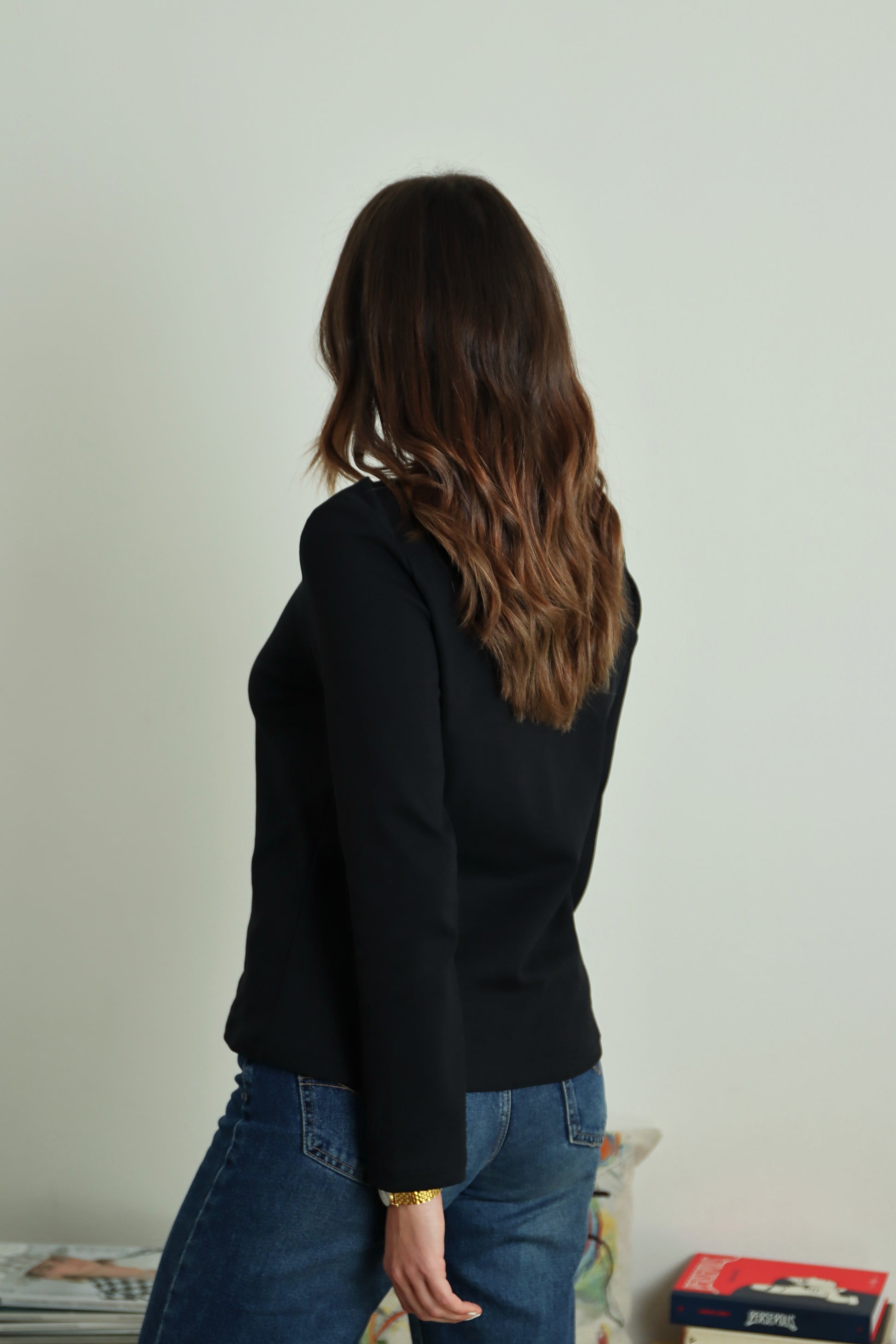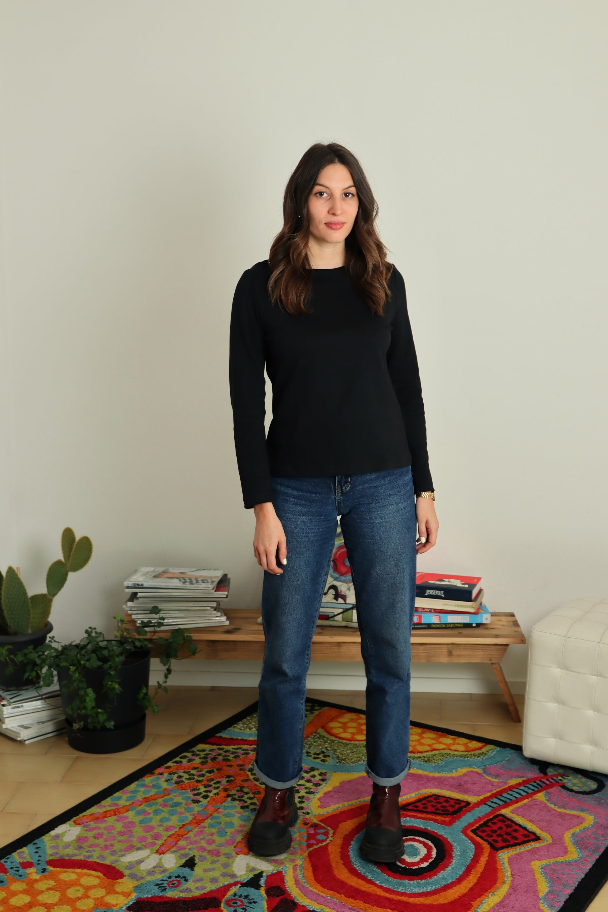 AUDREY è il top a maniche lunghe in cotone grazioso come l'elegante attrice da cui prende il nome. Lo scollo a barca sovrapposto incornicia le spalle, donando al capo un aspetto sofisticato, nonostante sia un semplicissimo sottogiacca, perfetto per chi non ama il collo alto.