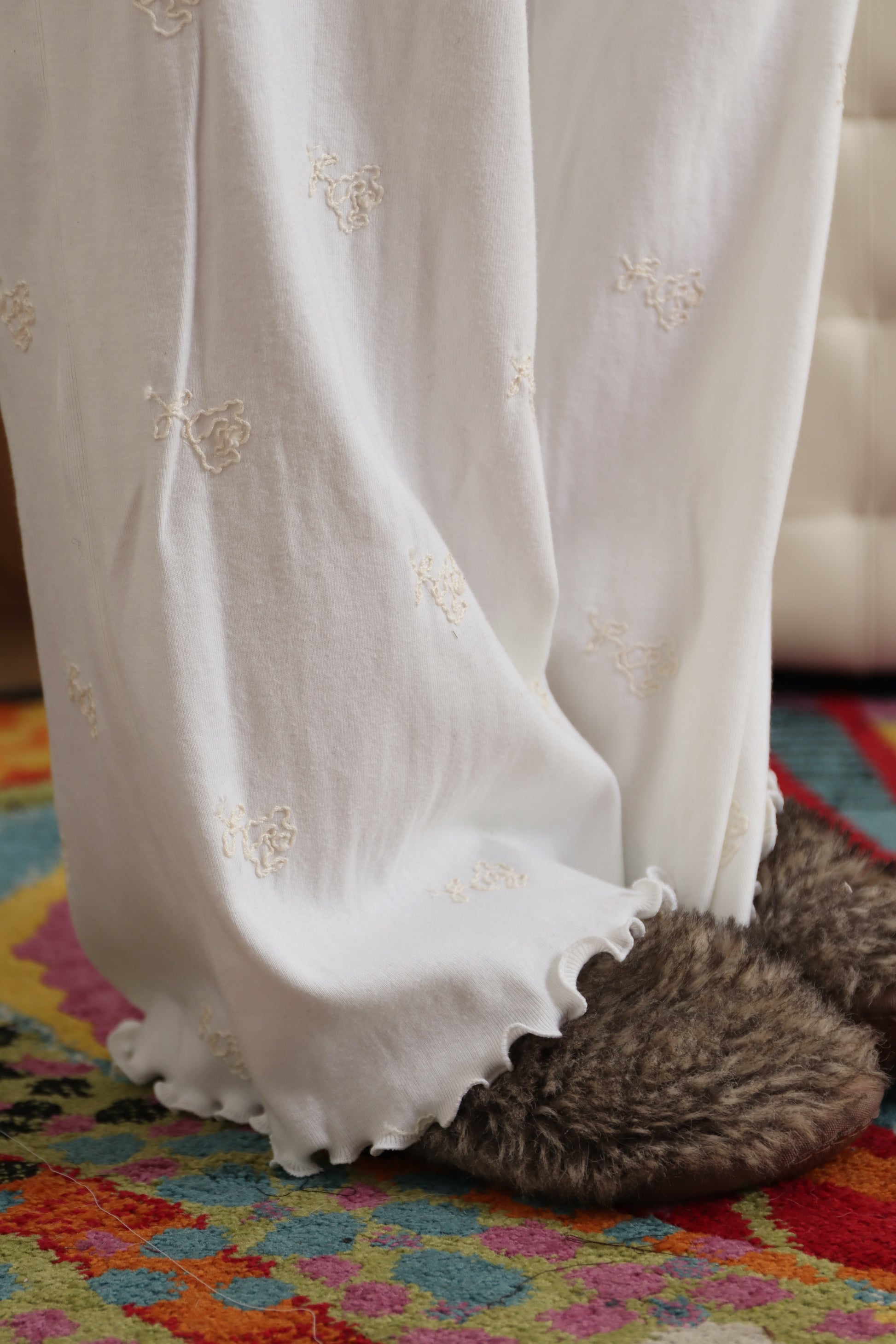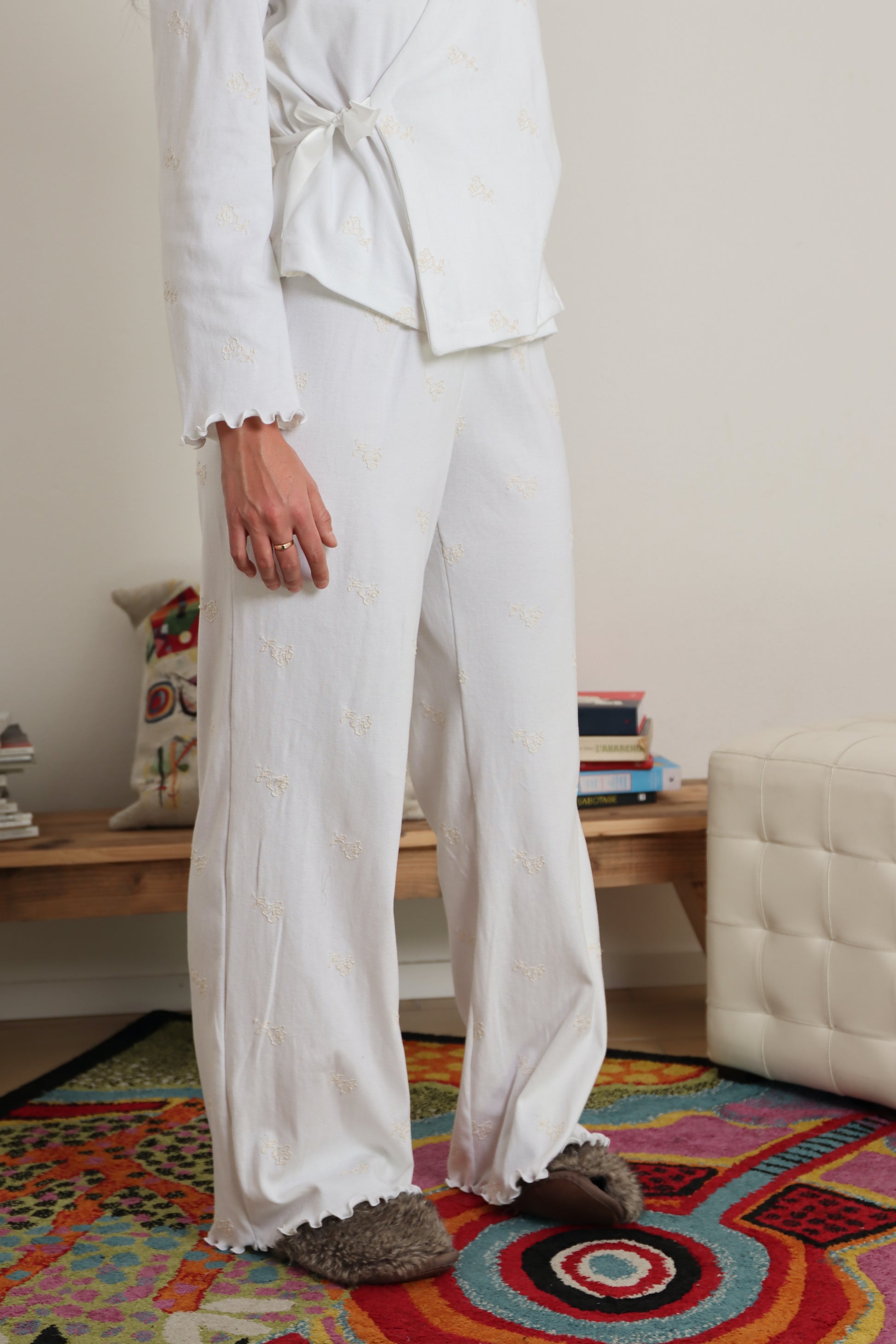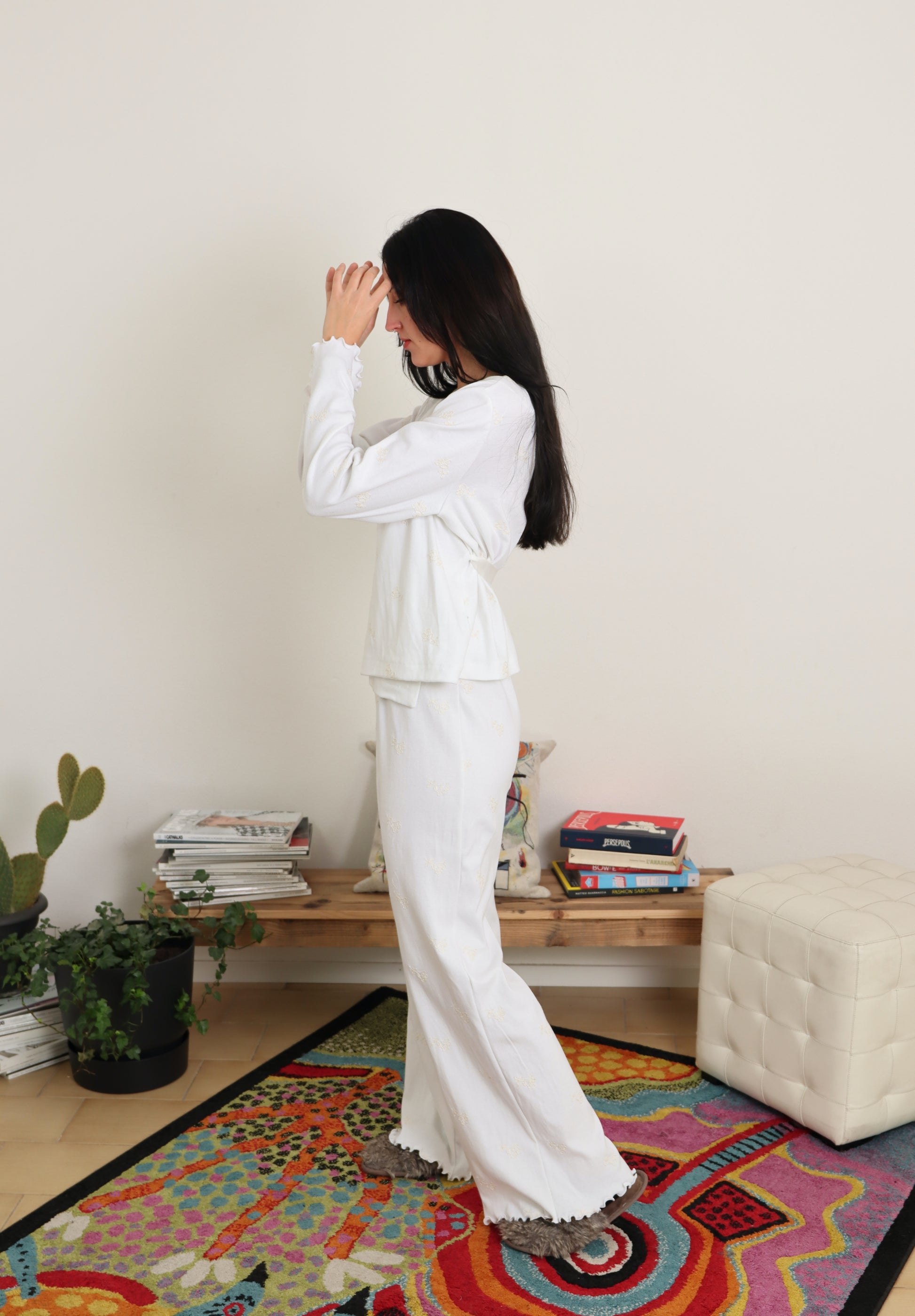 Il Pigiama Chiara è l'homewear romantico e femminile, ideale per chi ha voglia di sentirsi raffinata anche a casa. Dedicato a una cliente cui è stato regalato il set homewear dell'anno scorso con la costina bianca ricamata e l'ha follemente amato. Il modello è composto dalla parte sopra a portafoglio chiusa da un fiocco in raso bianco seta e dal pantalone largo con elastico e orlo a bambola.